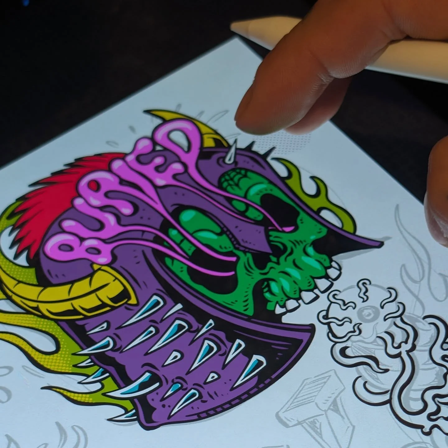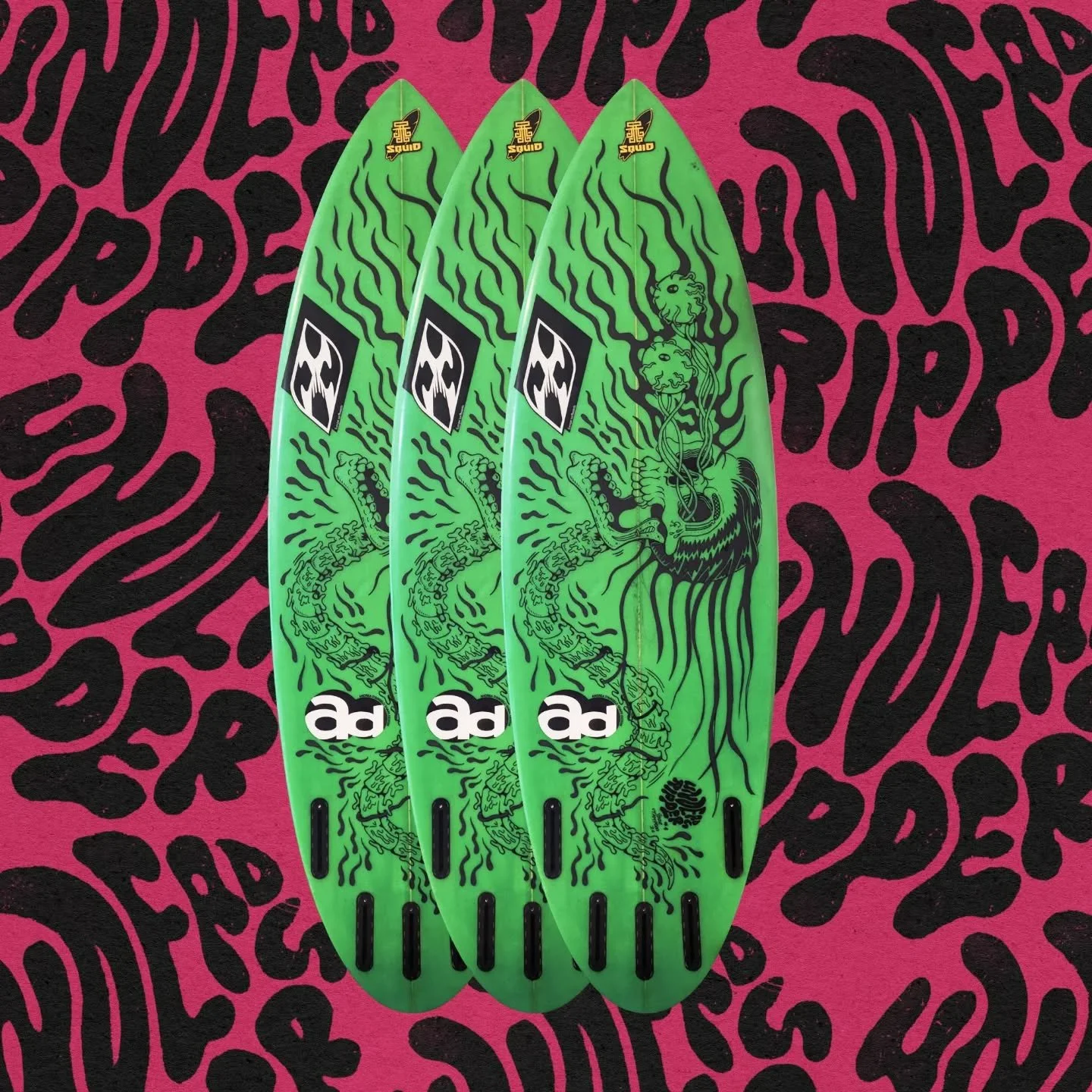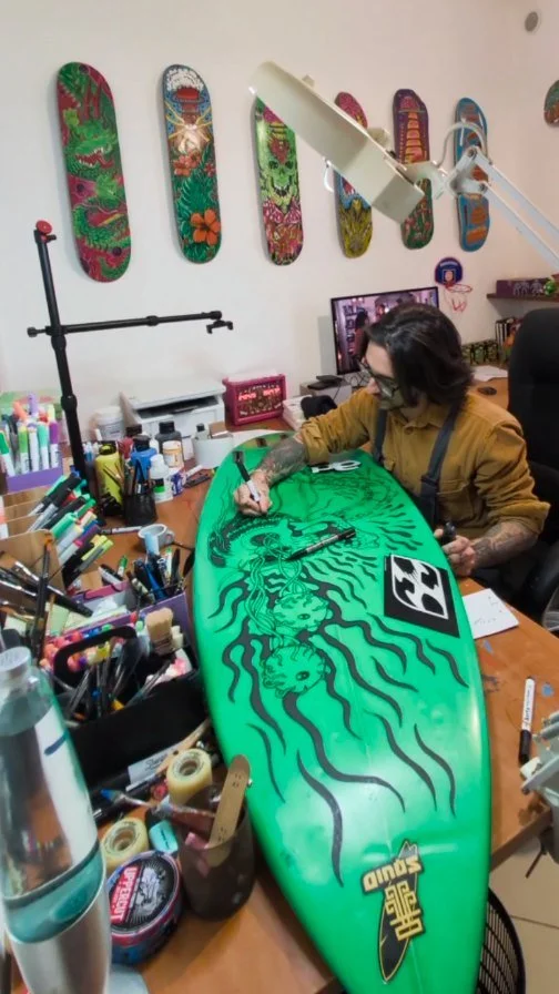 I bet you’ll be a lot faster with a freaking monster on your board. Skateboards and a snowboard deck both hand-painted and printed.