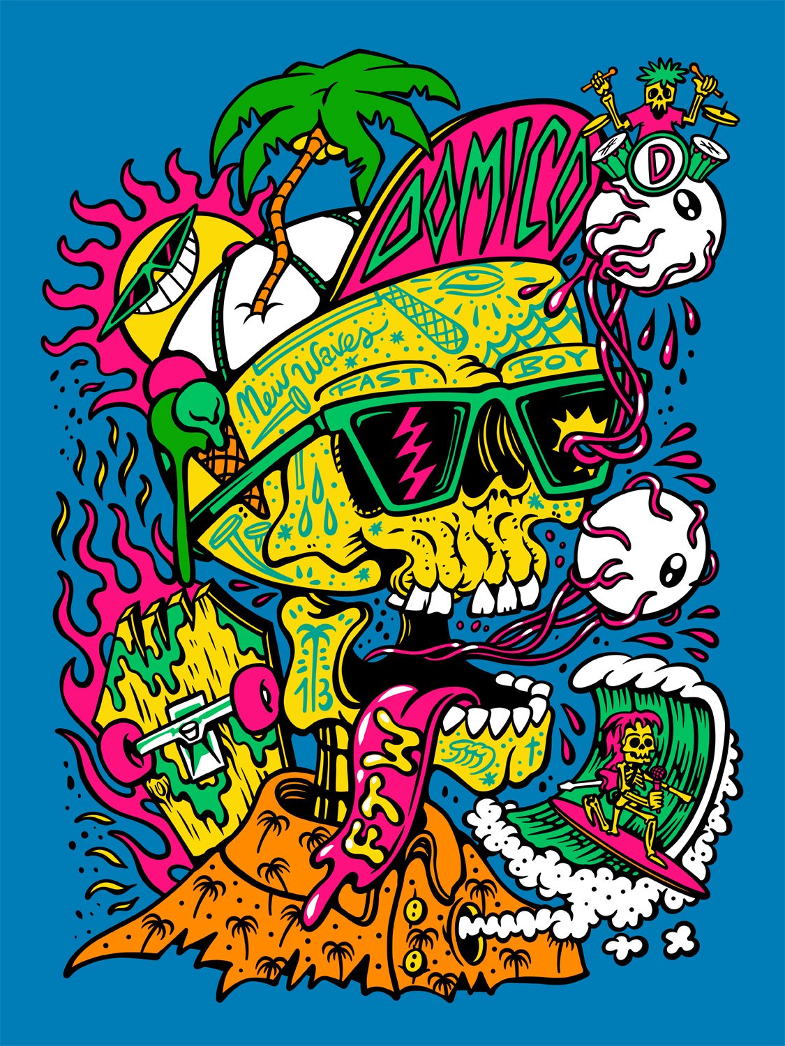 Behind the skeleton, there’s a wooden skateboard shaped like a coffin, on fire. An ice cream stuck in the head, a sun wearing shades and a palm tree popping out from the cap to complete the beach vibes.